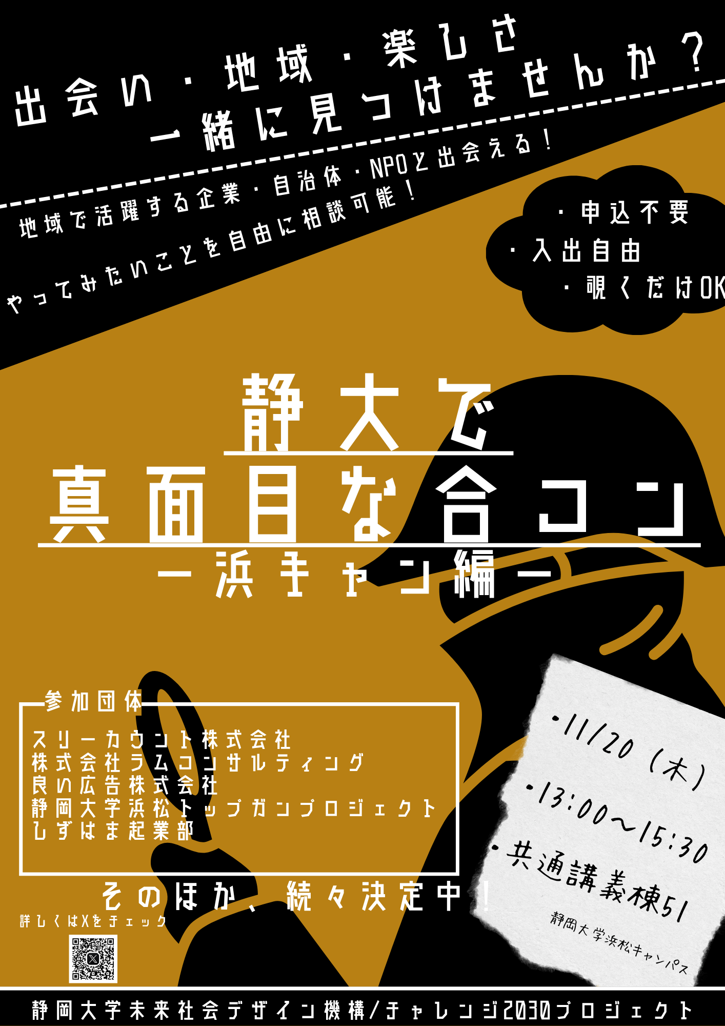 「静大で真面目な合コン -浜キャン編-」(2025年11月20日)を開催(NPO・企業・自治体と学生のマッチング) お知らせ 2025.10.24 学生と企業、NPO等の団体が出会う場を創出する「静大まじめな合コン」。地域に出て社会と関わる活動に関心のある学生に是非お声掛けください。 2025年11月20日(木)13:00~15:30 @静岡大学浜松キャンパス 共通講義棟51